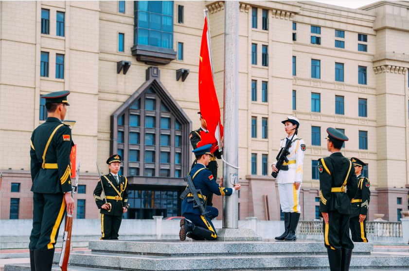 上午9时,升国旗仪式正式开始。国旗护卫队升旗手及护旗队员精神昂扬,迈着铿锵有力的步伐护卫国旗走向升旗台。伴随着雄壮激昂的《义勇军进行曲》,鲜艳的五星红旗在晨光之中冉冉升起,迎风招展。全体师生神情庄重,向国旗行注目礼,齐唱中华人民共和国国歌,向伟大祖国致以崇高的敬意和美好的祝福。
