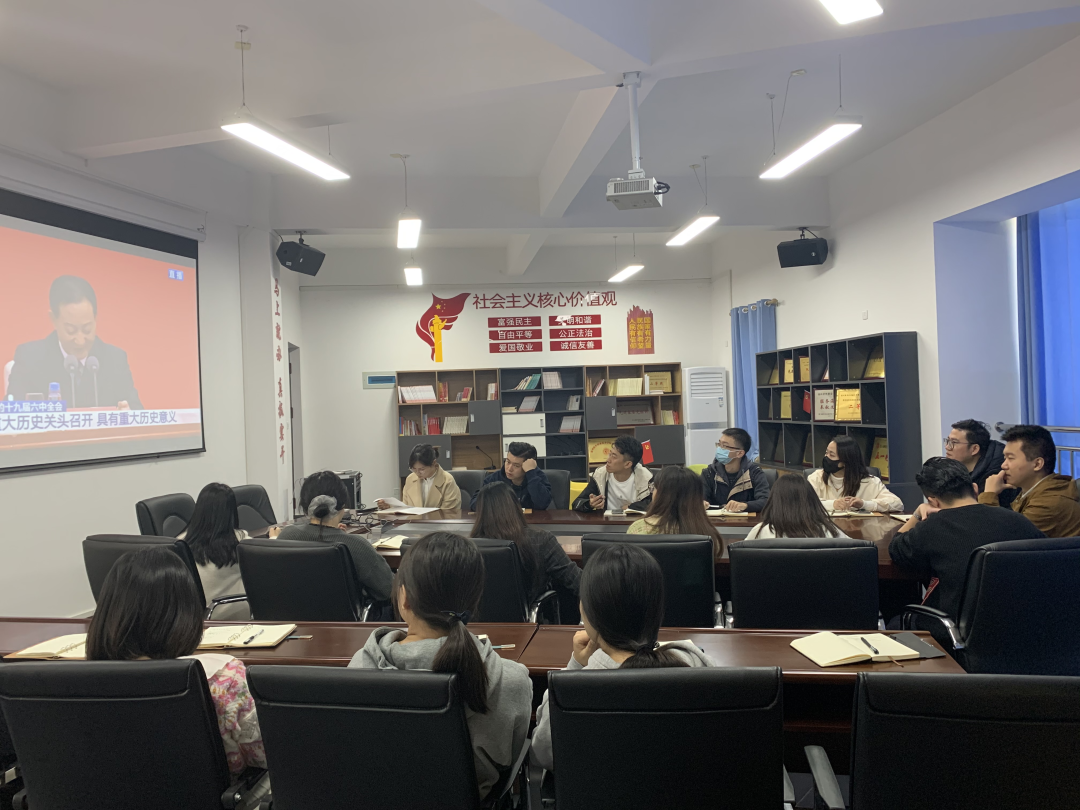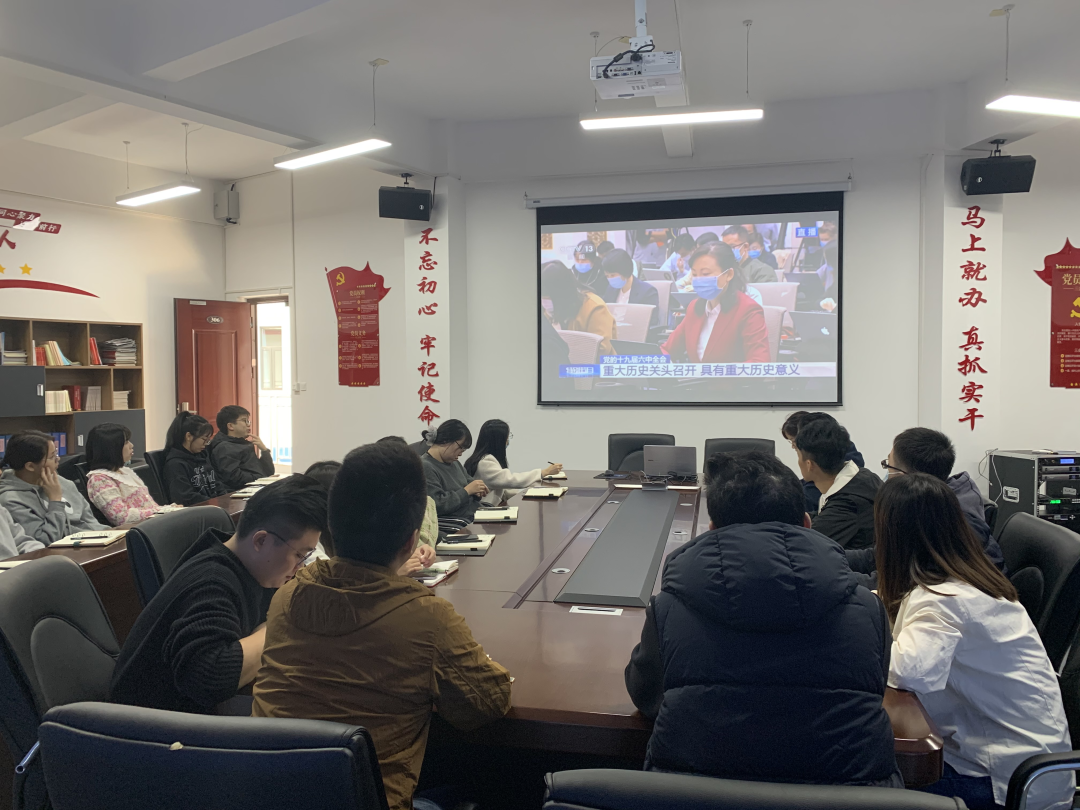 2021年11月12日上午10时,学校党委工作部组织在校党员干部在党员活动室收听收看党的十九届六中全会精神新闻发布会,通过集中观看和相互交流,学习党的十九届六中全会精神。