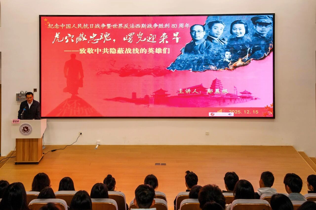 讲座中,鄢老师重点围绕钱壮飞、阎宝航、沈安娜、吴石四位隐蔽战线英雄人物,生动讲述了他们在特殊战场潜伏隐蔽、深入虎穴的群体英雄故事,传递他们“对党忠诚、坚守信仰、舍生取义、甘于奉献”的精神内核。整场宣讲内容翔实、真挚动人,让现场师生深切感悟到革命先辈用热血与生命铸就的不朽丰碑,深刻体会到其中的艰辛卓绝与伟大荣光。