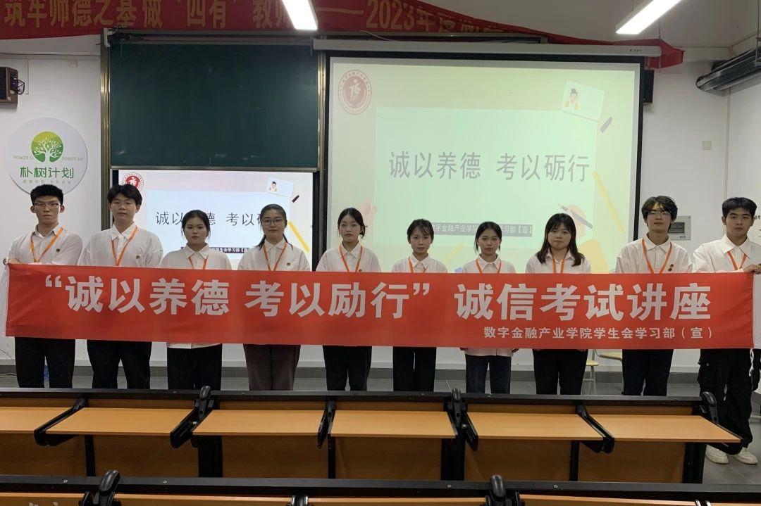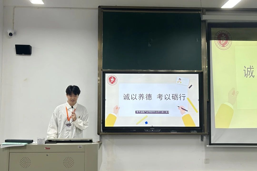 为进一步端正考风、严肃考纪,引导考生树立诚信考试的正确价值观,激励大家以更积极、更饱满的精神状态迎接期末考试,特此,数字金融产业学院学生会学习部于6月16日在教学楼开展以“诚以养德,考以励行”为主题的诚信考试讲座。