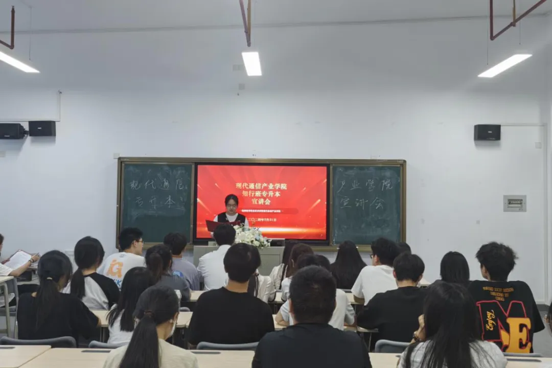 为加强同学们对专升本的认知,帮助更多的同学明确自己的学习方向,强化学习动力,深化对学习技巧的掌握,从而使同学们能够尽早且有效地规划个人学业,于5月31日中午,现代通信产业学院团委督导服务中心在A607教室举行知行班专升本宣讲会。现代通信产业学院知行班班主任曾雅菲老师,21级专升本成功优秀学生黄子杰、张哲、曹毅参加本次宣讲会。本次专升本宣讲会由现代通信产业学院督导服务中心纪检部副部长张欣怡同学主持。