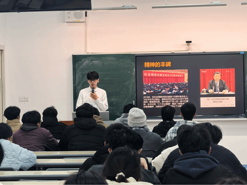 为深入学习周恩来同志的崇高风范与伟大精神,引导入党积极分子们坚定理想信念、强化使命担当,在周恩来同志逝世50周年之际,我校未来技术产业学院学生第一、二党支部于2026年1月20日在L322开展“穗穗红芯·麦苗青”党员微党课第二十三讲。本次课程由学生党员陈俊鹏同志主讲,通过重温周恩来同志的光辉事迹与精神品格,激励入党积极分子们在新时代新征程中汲取榜样力量,践行初心使命。