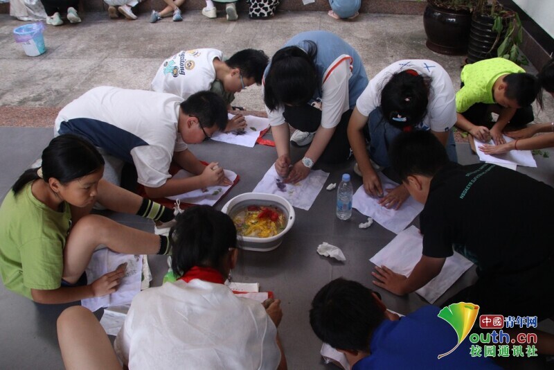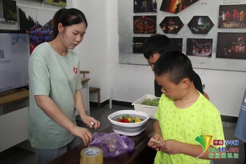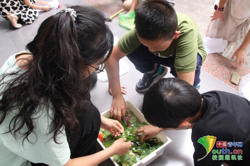 图为实践队员帮助小朋友共同制作植物拓染作品。 林馨 供图