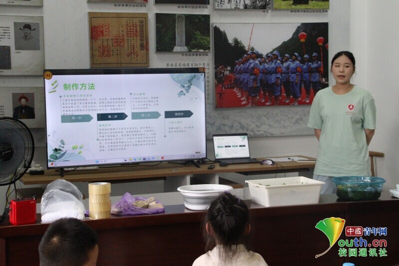图为实践队员结合PPT等数字资源为小朋友讲解植物拓染的制作方法。 林馨 供图