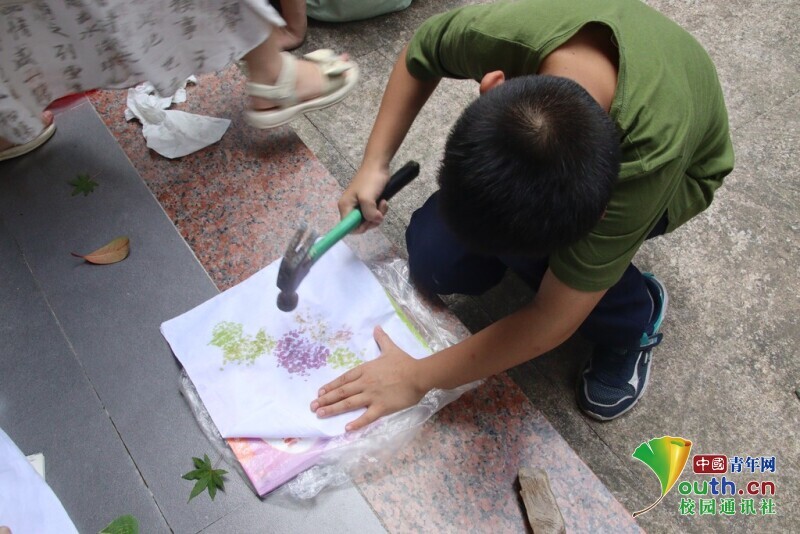 图为在小朋友们的敲打下植物拓染作品逐渐呈现。 林馨 供图