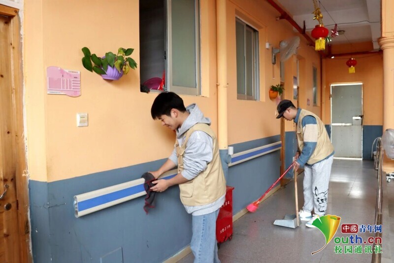 图为福州软件职业技术学院数据产业学院志愿者帮助老人打扫卫生。中国青年网通讯员 肖桂晴 摄