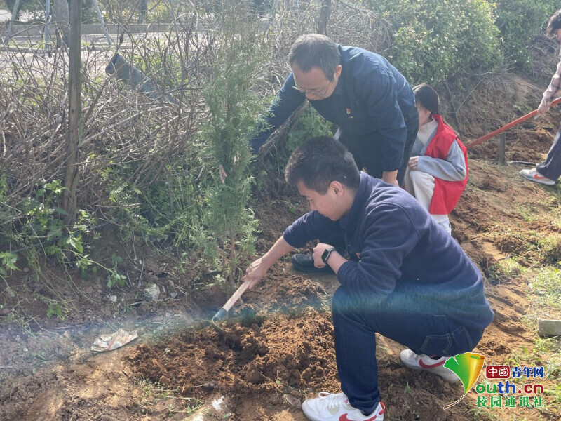 图为党员教师带队栽种树苗。中国青年网通讯员 蔡悦盛 供图