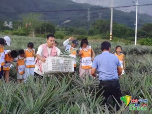 供图图为志愿者正在与孩子们一起玩游戏。林竞男 供图图为志愿者正在帮助农场主王森谅采摘凤梨。林竞男 供图